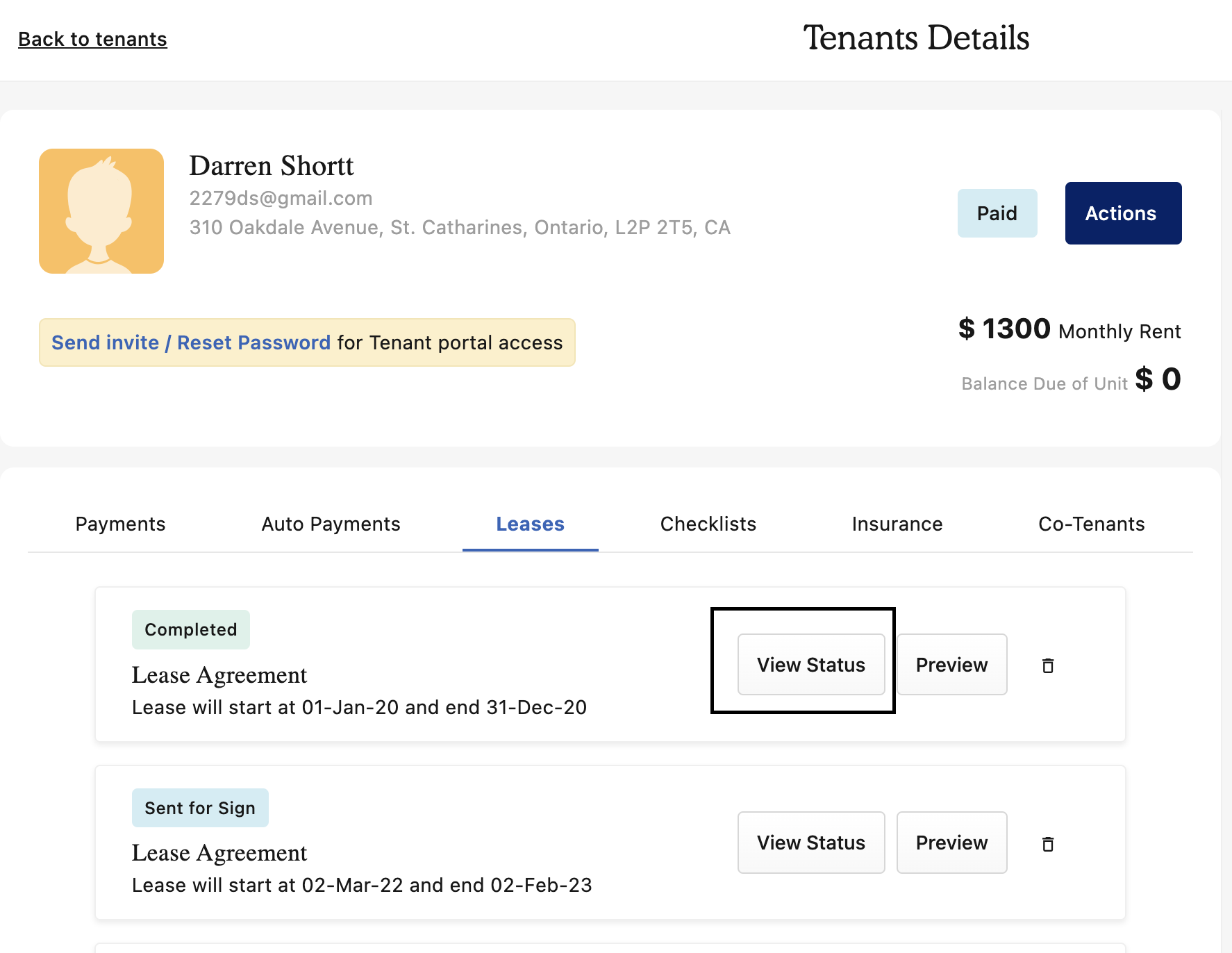 Goto Tenant details page from the Tenant tab. Click on the lease tab --> View Status.